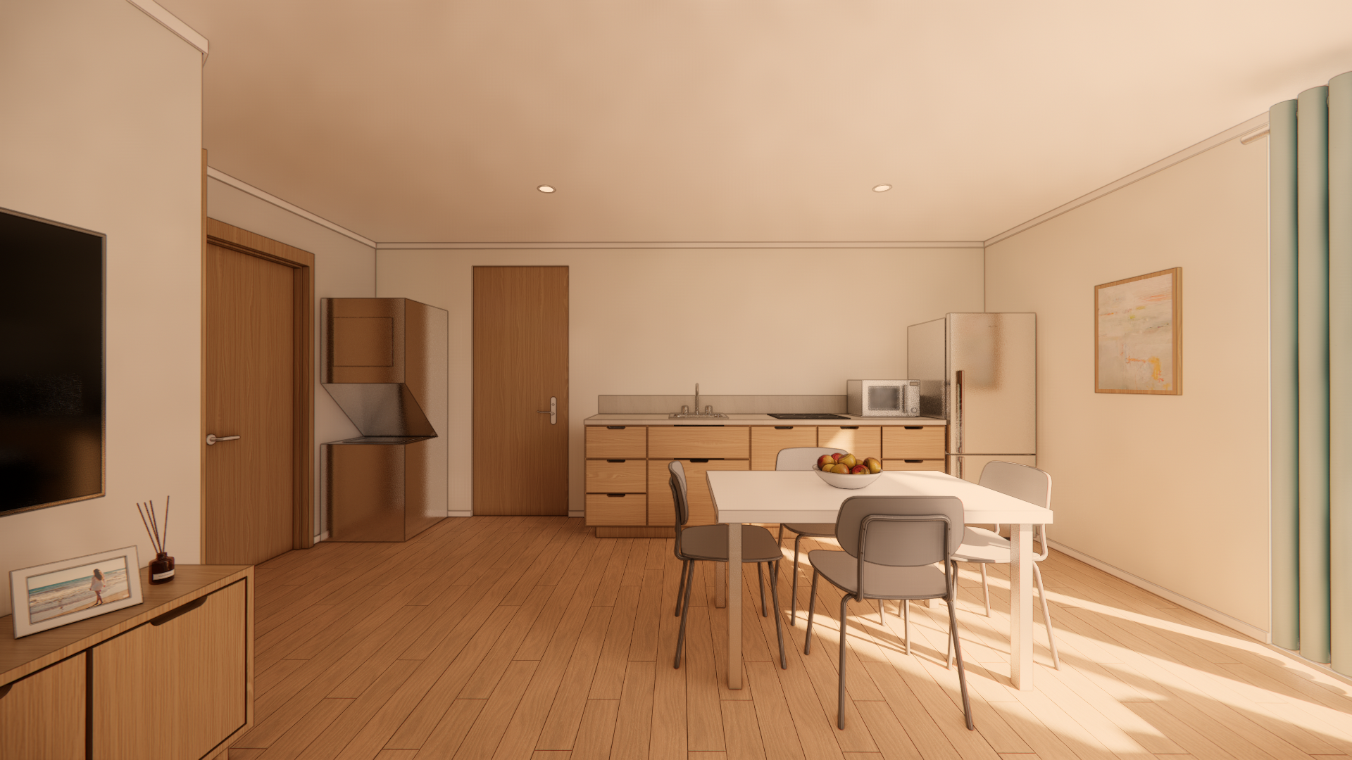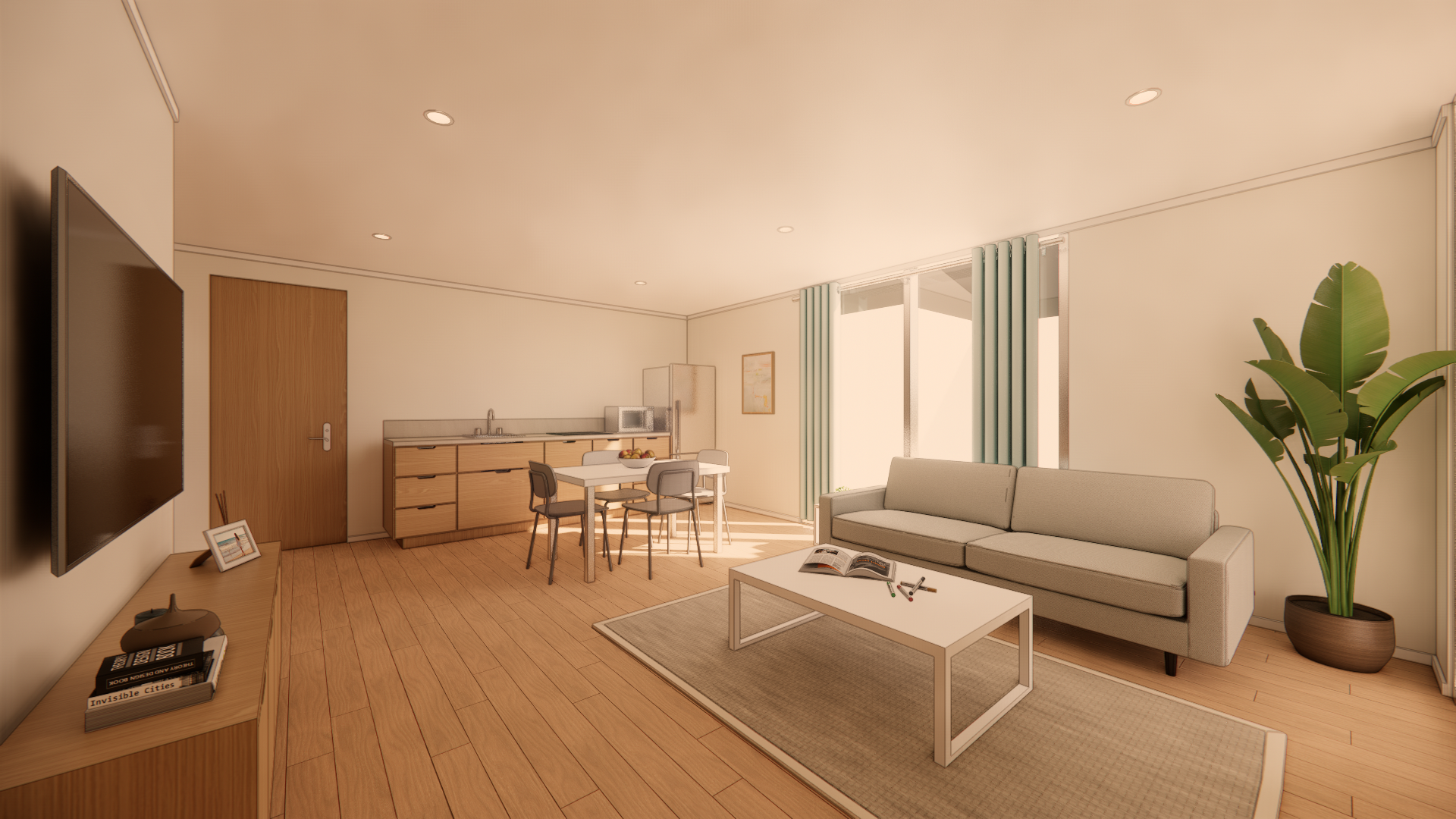 Overall kitchen, dining, and living area