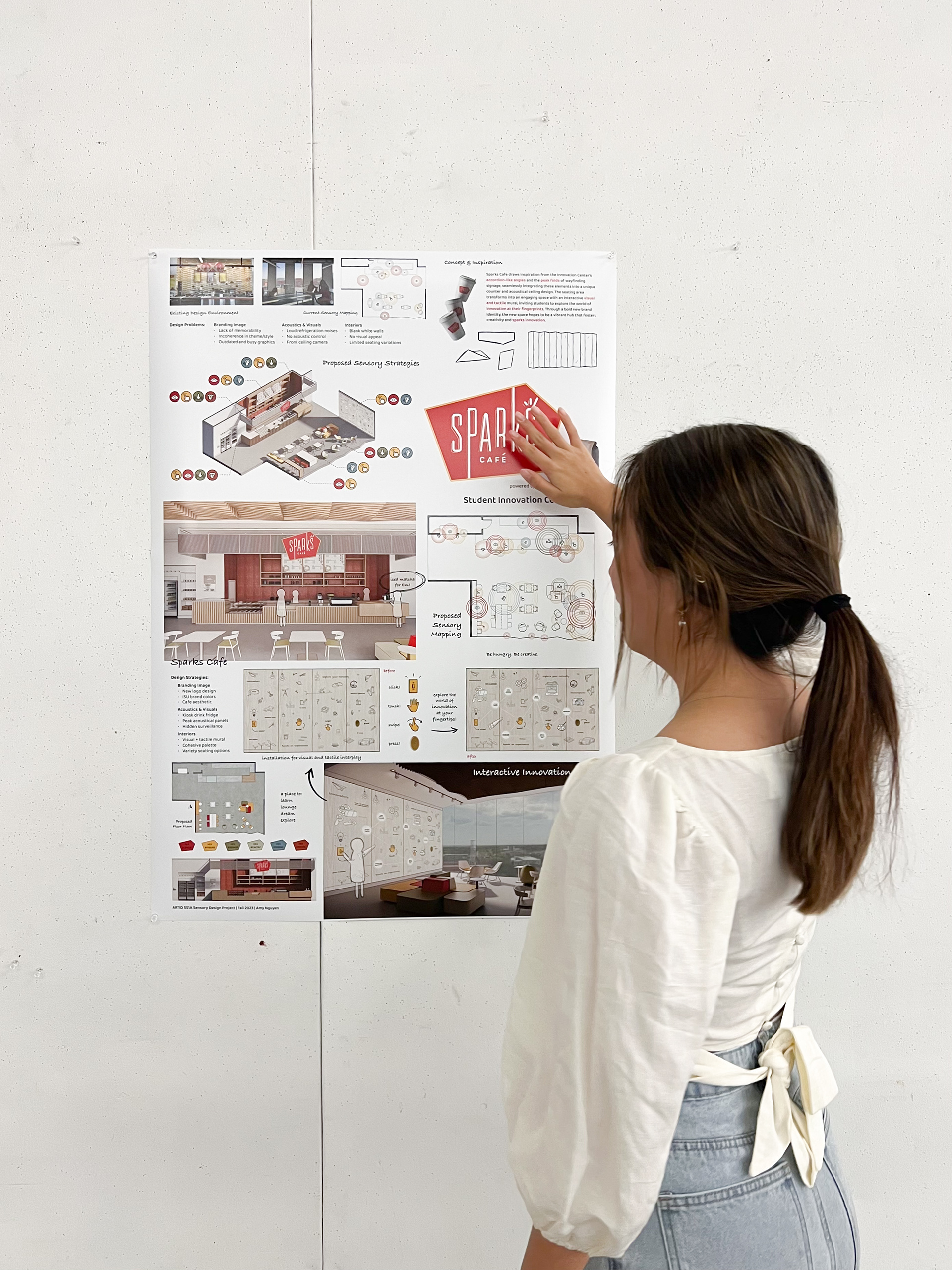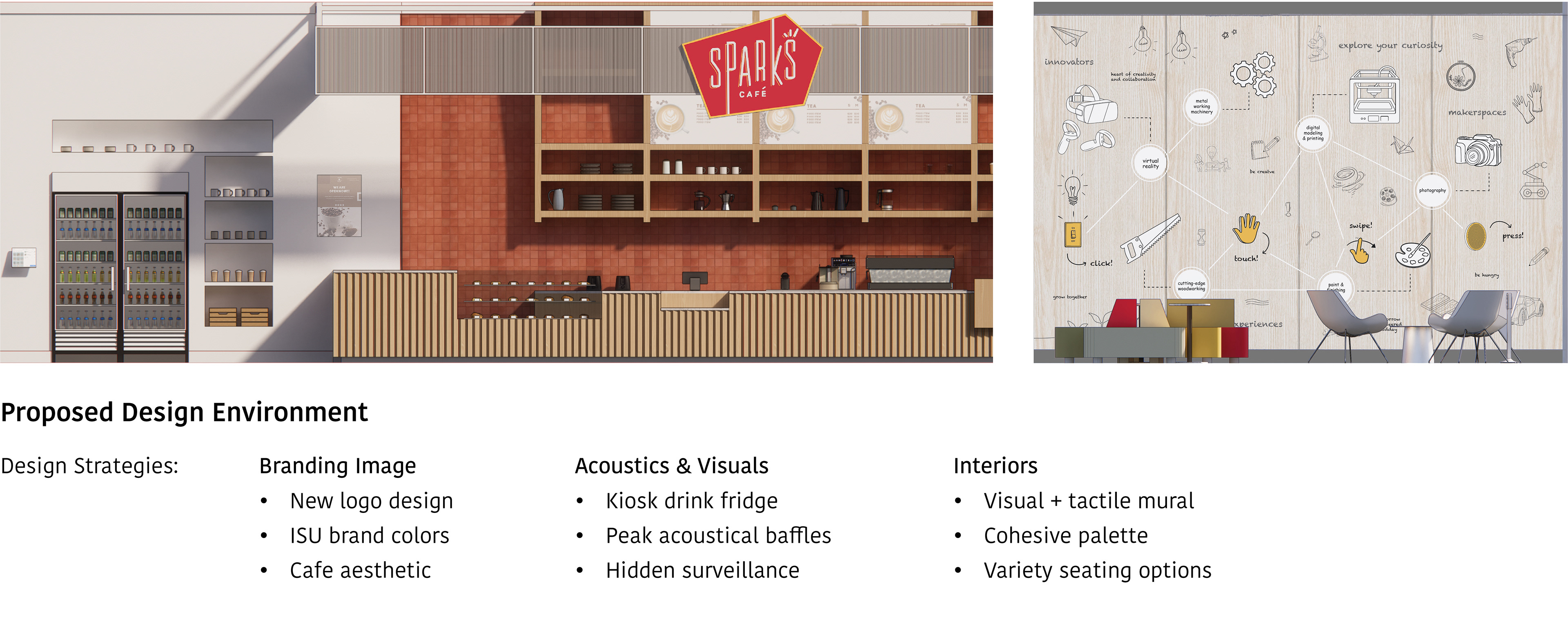 An Iowa State University campus cafe calls for a new brand identity and redesign that can be envisioned as a vibrant hub to foster creativity and spark innovation. Sparks Cafe draws inspiration from the Innovation Center’s accordion-like angles and the peak folds of wayfinding signage, seamlessly integrating these elements into a unique counter and acoustical ceiling design. The seating area transforms into an engaging space with an interactive visual and tactile mural, inviting students and visitors to explore the world of innovation at their fingertips.